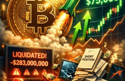 Короткая сжатие поднимает цену Биткойна выше $75K, $283M ликвидаций